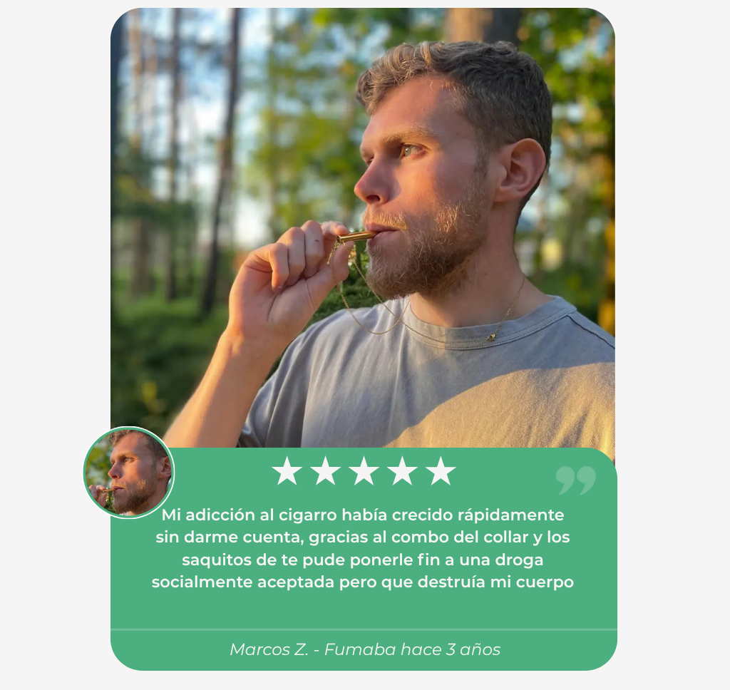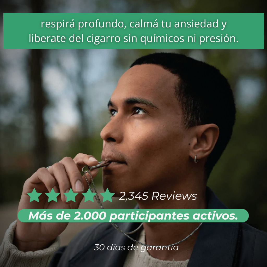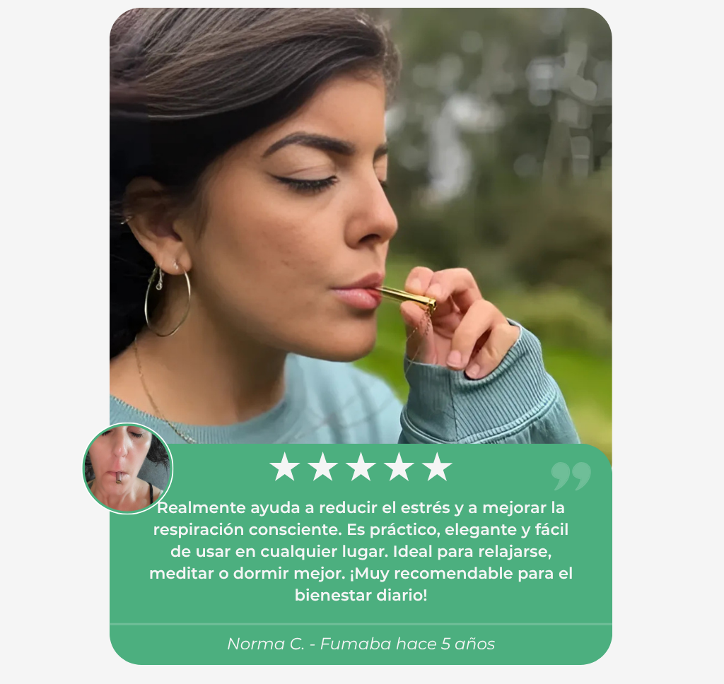 Sí. El Collar Respira actúa sobre el sistema nervioso parasimpático, el encargado de la relajación natural del cuerpo. Al dirigir tu respiración, reduce el estrés y reemplaza el acto físico de fumar con un ritual saludable. Miles de personas han logrado dejar el cigarro o el vape con este método.